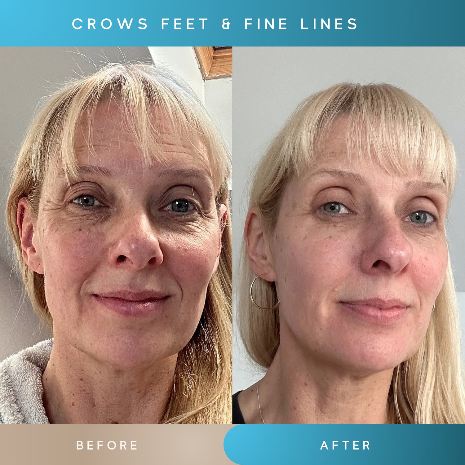 Red LED and RF heat promote collagen renewal deep within the skin, reducing the appearance of fine lines and softening wrinkles for a smoother look.